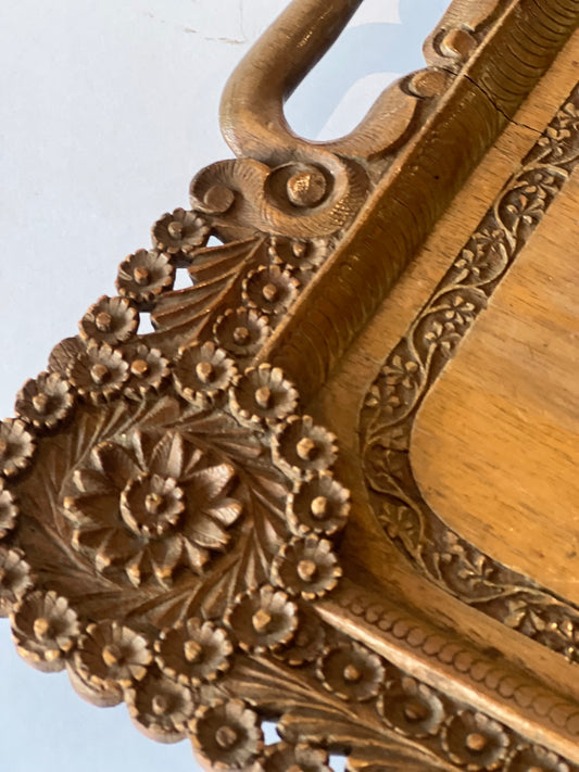 Hand-Carved Wooden Indian Tray with Intricate Detail (c.1900, L60 × W34 cm)
