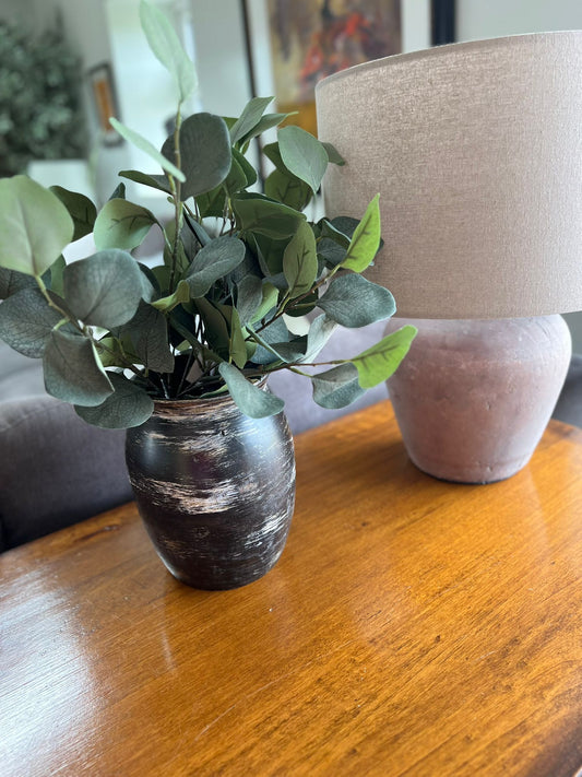 Small Indonesian Handmade Wooden Pot – Black Brown with White Splashes (20x16cm)
