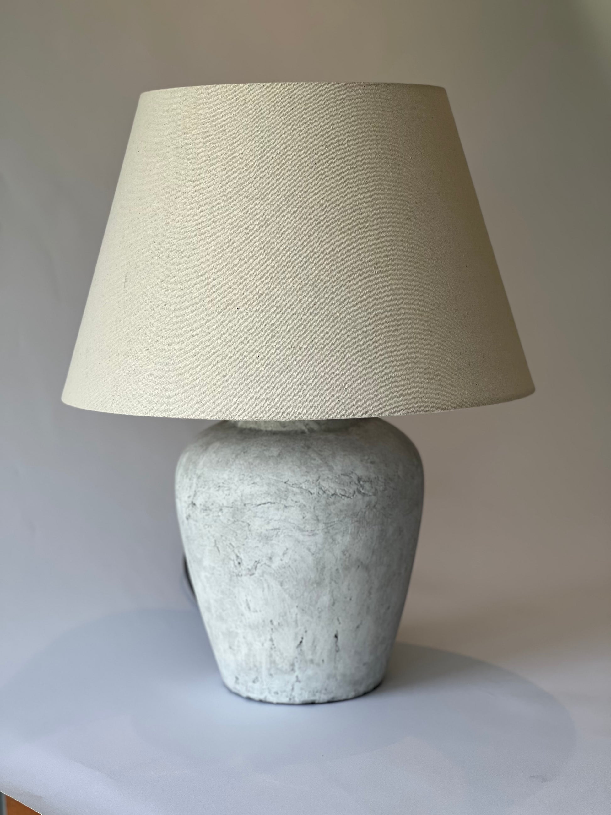 An elegant table lamp with an antique-inspired white base, paired with a natural linen shade. Its timeless design and neutral tones make it a versatile piece, perfect for adding warmth and character to any room. The combination of classic detailing and rustic texture creates a soft, inviting glow.