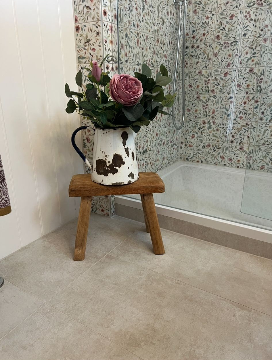 A charming vintage enamel jug in white with a navy blue handle and rim, showing authentic signs of wear with enamel worn in places. Full of rustic character, this jug makes a perfect decorative accent for farmhouse, country, or vintage-inspired interiors, adding history and personality to any space. H20 D18