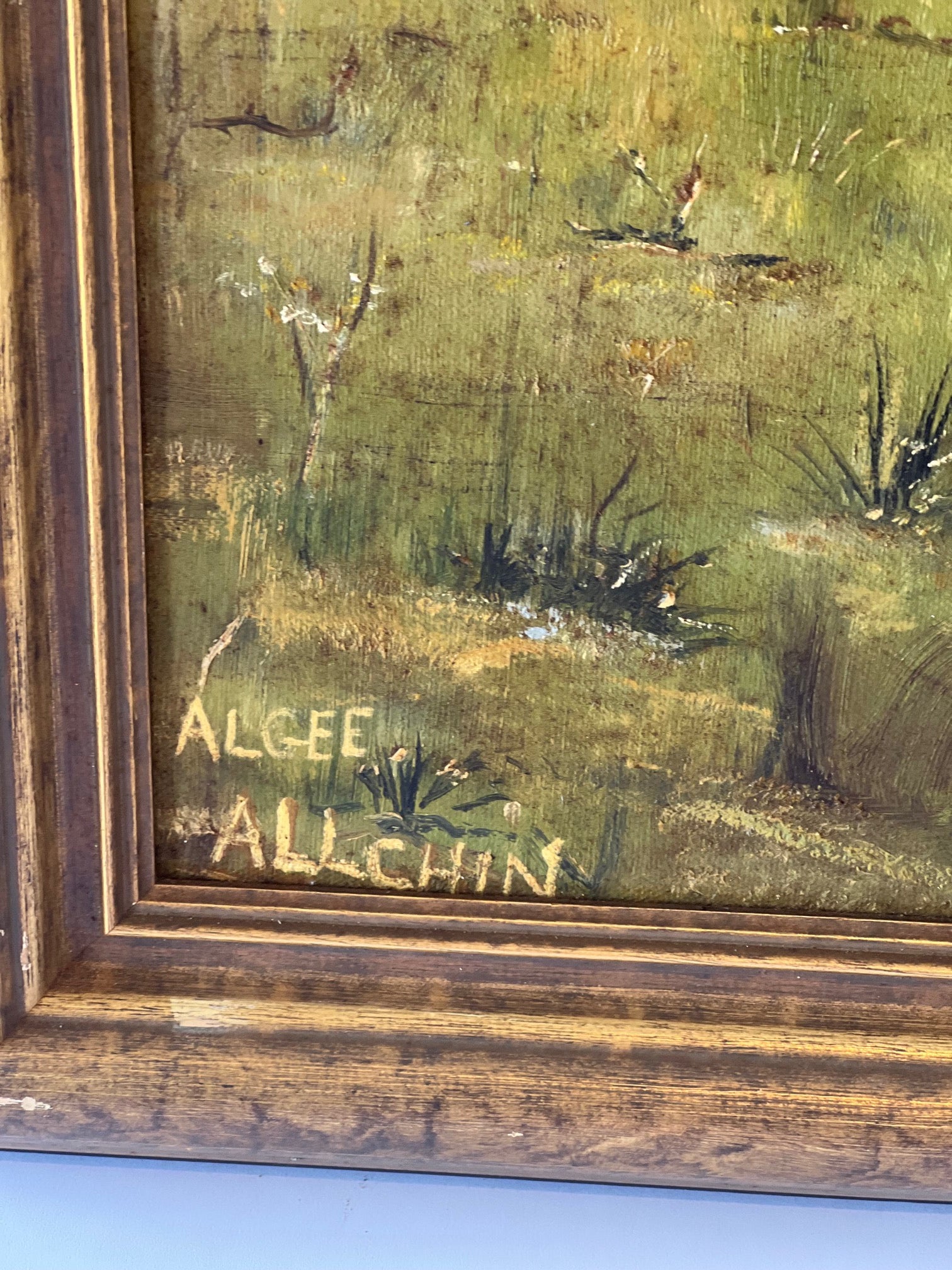 A beautiful vintage oil painting capturing a serene landscape in soft tones of blue, green, and yellow. The brushwork and gentle palette create a calming scene full of depth and texture. Showing signs of age that add to its charm and authenticity, this piece brings character and timeless beauty to any wall.